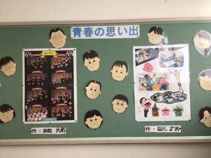 2年生の学年掲示板に、生徒作の掲示物が飾られています。定期的に貼りかえていますが、今回は、合唱祭や普段の学校生活の様子について、写真などをうまくレイアウトしながらまとめられていました。工夫の跡がたくさん見られます。