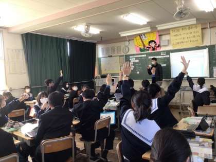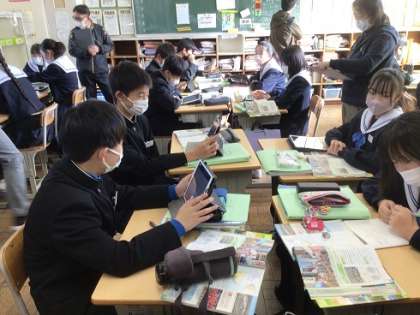 12月13日(水)授業の様子1 公開日 2023/12/13 更新日 2023/12/13 お知らせ 1年生の社会科です。「アメリカと移民の関係性を探ろう」の学習課題のもと、移民と産業や文化との関係や課題等について調べたことを伝え合ったり、発表したりしました。学習用タブレットにまとめながら、学習に取り組んでいます。 この授業は、他の教員が参観して、授業について学ぶ場としても設定されています。社会科の教員を中心に、授業について学び合う場としました。
