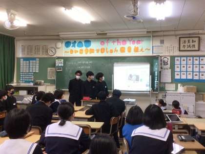 3年生です。SDGsに関する豊田市の課題について調べて、プレゼン資料にまとめ、発表し合っています。工夫した資料が作られていて、感心しました。