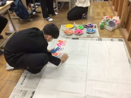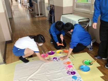 来年1月に予定されている「自然教室」に向け、2年生の準備が着々と進んでいます。写真は、大きな布に一人一人の手形をつけているところです。立志式で使うようです。