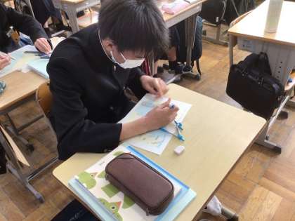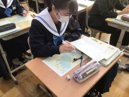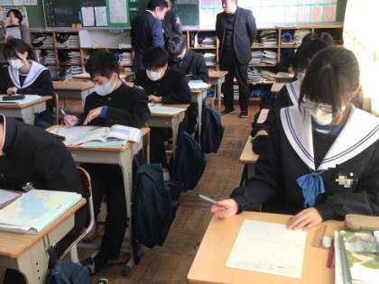 3年生の数学科です。円の性質を使って、海上の船の位置を見つける問題に挑戦です。これまで学習した作図の技能や円周角の定理を確認しながら、授業を進めました。