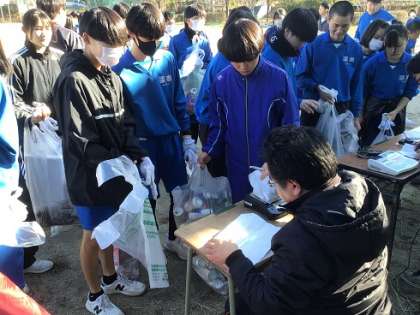写真は、集めたごみの計量を行っている様子です。ゴミ拾いをルールのあるスポーツとして行い、集めたごみの量をポイント化して勝敗を競います。今回、移動時間を含めて1時間半弱の活動時間でしたが、3年生全体で集めたごみの総重量は180キログラムを超えました。