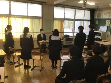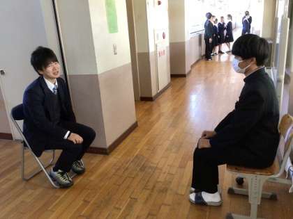 3年生です。進路目標達成に向けて、面接練習に取り組んでいる学級がありました。面接には、集団面接と個人面接があります。