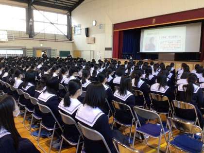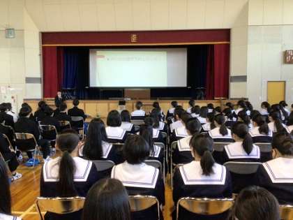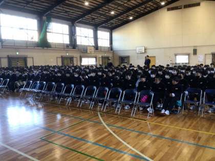 明日からの冬休みに向けて、各学年ごとに学年集会を開きました。写真は1年生の様子です。冬休み中の生活や学習について、確認をしました。