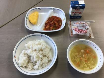 今日の給食は、今年最後となりますが、クリスマスにちなんだ献立でした。チキンライス、パスタスープ、オムレツ、ガトーショコラが出ました。チキンライスは、ごはんと具を自分で混ぜて作ります。