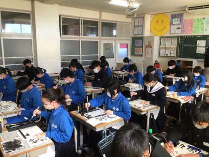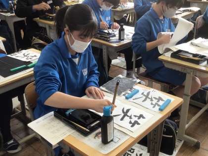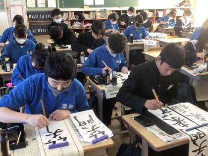 写真は2年生の様子です。どの学年も、書き初めにふさわしい静かな雰囲気のなか、新しい年にかける思いをこめて筆を走らせていました。