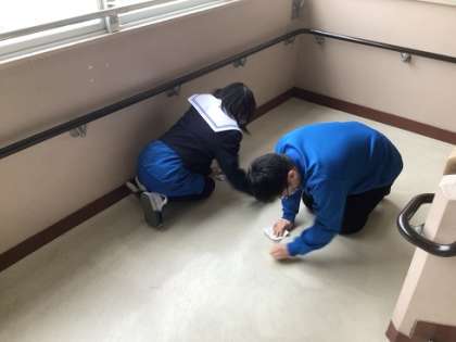 床の汚れをゴシゴシと力をこめながらきれいにしたり、丁寧に窓ふきをしたりなど、黙々と清掃活動を行っています。