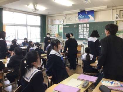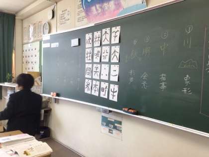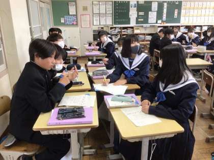 1年生の国語科です。漢字の成り立ちについて学習しています。ものの形をかたどって描かれたものから、どんな漢字が生まれたかを考えました。予想したものと違っていたことが分かると、驚いている生徒がたくさんいました。