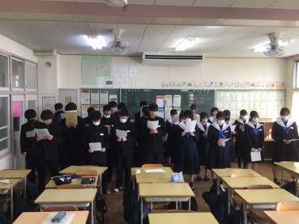 2年生の学級活動です。1週間後に迫った自然教室の準備を進めています。自然教室の中で予定されている立志で発表する誓いの言葉の練習を個人や学級で取り組んだり、歌の練習をしたりしていました。