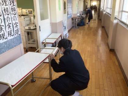 1月16日(火)委員会活動の様子2 公開日 2024/01/16 更新日 2024/01/16 お知らせ 給食委員会です。給食で使用する配膳台をきれいにしています。これからも衛生的な環境で、給食を進めていきたいですね。