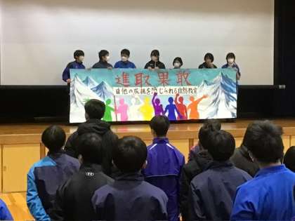 1月18日(木)自然教室1日目4 公開日 2024/01/18 更新日 2024/01/18 学校行事 自然教室スローガンの披露です。生徒の手作りです。 「自然教室スローガン」 進取果敢(しんしゅかかん)〜自他の成挑を感じられる自然教室〜 進取果敢…自ら進んで物事に取り組むこと 成挑…様々なことに挑戦し、成長すること このスローガンのもと、がんばってきます。
