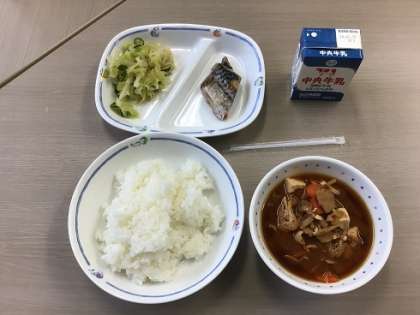 今日の献立は、ごはん、豚汁、たくあんあえ、さばの煮つけでした。