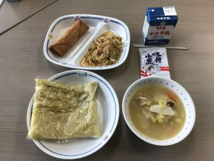 1月24日(水)〜30日(火)は、「全国学校給食週間」です。今日の献立は、とんこつラーメン、ナムル、春巻き、乾燥小魚でした。献立にラーメンが出る日は、とても少ないです。