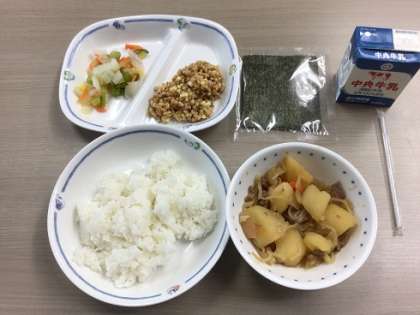 1月24日(水)〜30日(火)は、「全国学校給食週間」です。今日の献立は、肉じゃが、はくさいとかぶの酢の物、ごはん(納豆巻き)でした。チーズの入った納豆の献立は、豊田市以外ではあまり見かけない献立のようです。写真は1年生です。