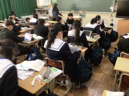 1年生の理科です。地震の揺れの伝わり方について、学習用タブレットで計算しながら学習を進めています。