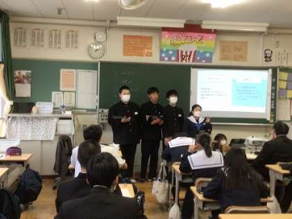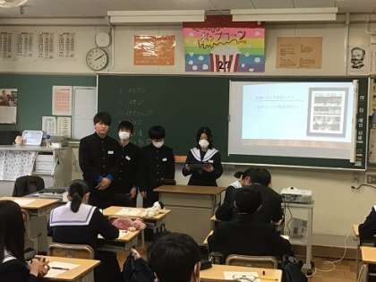2年生で継続的に取り組んでいるインターンの学習です。今日は、生徒自らが作成したプレゼン資料等をもとに、これまで企業について調べたり考えたりしてきたことを学級で発表し合いました。