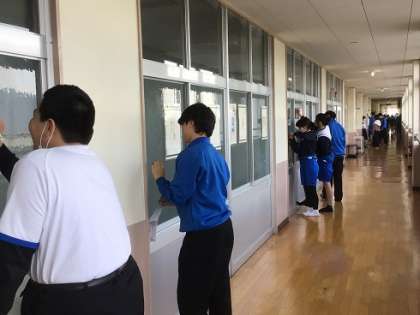 2月9日(金)清掃の様子2 公開日 2024/02/10 更新日 2024/02/10 お知らせ 教室や廊下の床を熱心にふくなど、清掃活動をがんばる逢中生をたくさん見かけます。下の写真は、ガラスについた掲示物の糊のあとをきれいにしてくれているところです。