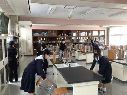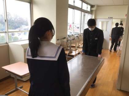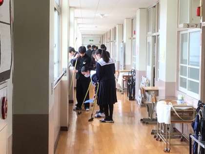昨日の大掃除の際、教室の外に出した椅子や机などの復旧作業をしています。廊下などの掃き掃除もしてくれました。