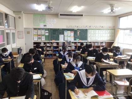 あと少し!最後までがんばり抜きましょう。写真は、テスト直前の2年生です。教科書やプリントの見直しなど、集中して取り組んでいました。