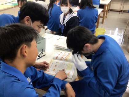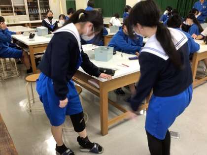 1年生の家庭科です。ゴーグルをつけたり足にサポーターをつけたりして、高齢者の方のものの見え方や動きにくさを疑似体験しています。こうした体験活動を通じて、高齢者とのかかわり方を学んでいきます。