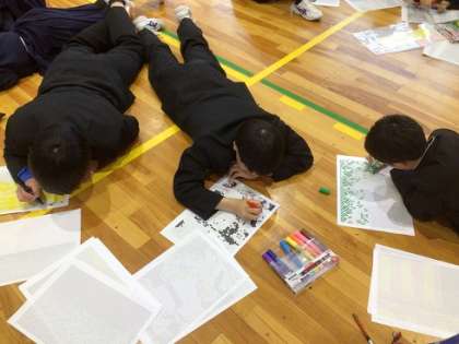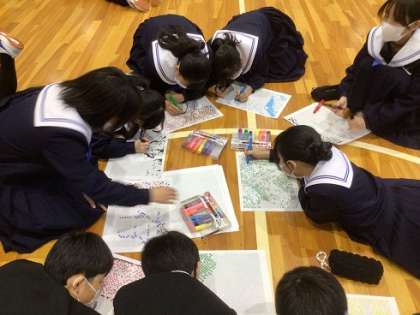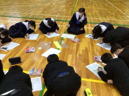 卒業生する3年生に感謝の気持ちと感動を届けようと、がんばっています。写真は、体育館でモザイクアートを作成している様子です。作業量がかなり多くなりそうですが、とても熱心に取り組んでいます。