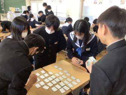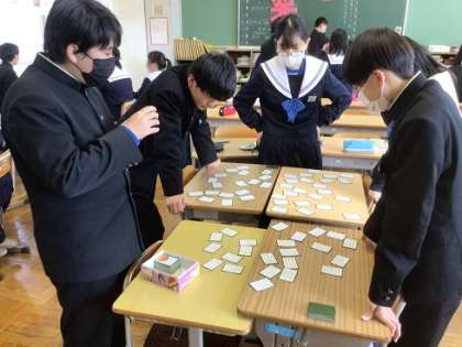 3年生の国語科です。古文の学習の一つとして、百人一首に挑戦です。日頃あまりなじみのないものですが、うまく取れましたか?