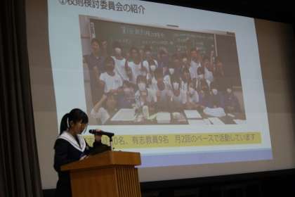 逢妻中学校の校則について、生徒主体で検討を進めている校則検討委員会。今日は、卒業式の全校練習の時間を使って、これまでの委員会で検討してきた内容について発表がありました。