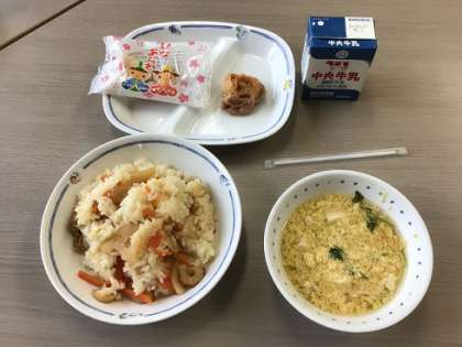 3月3日はひなまつりです。今日は、そのことにちなんだ給食でした。ちらしずし、ひなあられ、かきたま汁、とり肉の照り焼きが出ました。