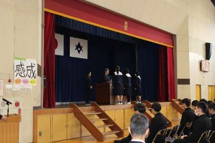 1時間目に、豊田市書き初め展(特選3名、秀逸7名、入選17名)と、豊田南ライオンズクラブ善行生徒表彰を行いました。全校で栄誉を称え、拍手を贈りました。