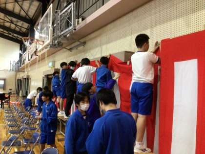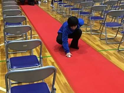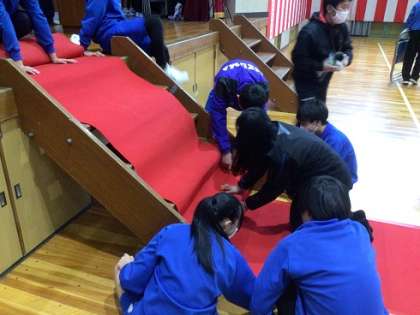体育館での会場設置です。紅白幕や赤絨毯の準備をしています。とても丁寧に作業を進めていました。
