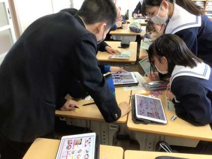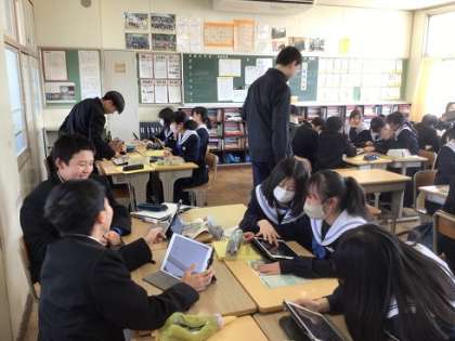 3月7日(木)職業体験に向けて 公開日 2024/03/07 更新日 2024/03/07 学校の特色ある活動 1年生が、3/15金に行うラグナシア職業体験の準備をしています。教室をのぞくと、昼食をどうするか、タブレットを使いながらグループで話し合っていました。当日が楽しみですね。