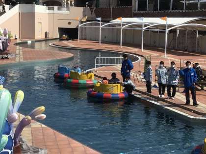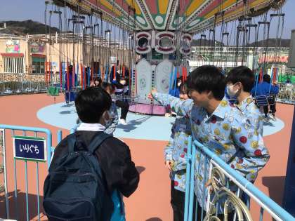 アトラクションのスタッフを体験しています。一般のお客さんはもちろんですが、相手が逢中生であっても、スタッフとお客さんという立場で対応します。
