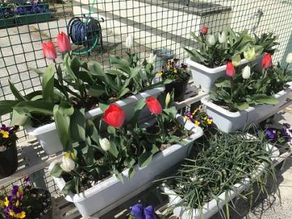 プランターのチューリップが開花し始めました。公務手の方が、温室で管理しながら育ててくださっています。入学式には、たくさんの花々で新入生を迎えることができそうです。