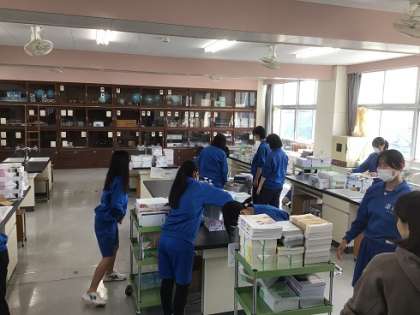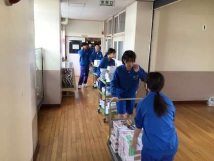 新しい教科書類を各教室に運んでいます。たくさんありましたが、よくがんばってくれています。
