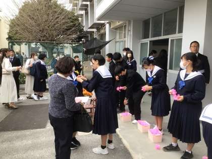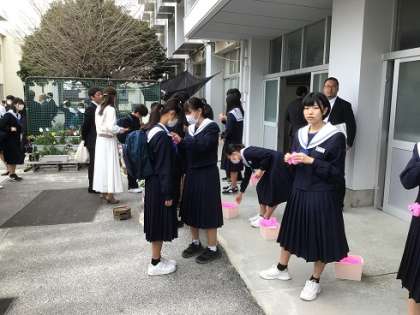 4月5日(金)入学式・始業式4 公開日 2024/04/06 更新日 2024/04/06 お知らせ 新入生が登校してきました。受付で、3年生が胸に花をつけています。先輩として、とても丁寧に行ってくれました。