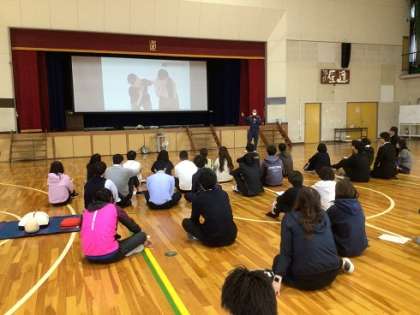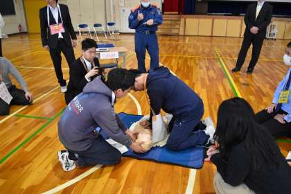 生徒下校後、消防署の職員の方を講師にお招きして行いました。学校生活で怪我や急病等が起きた場合の対応や、救急搬送までの手順など、実際の場面を想定しながら取り組みました。