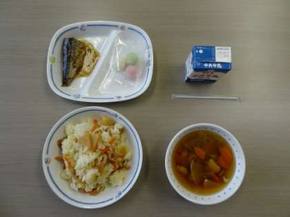 今日の給食は、お花見をイメージした献立です。ちらしずし、かしわ汁、いわしの梅煮、花見だんごが出ました。