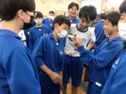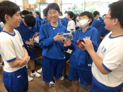 握力です。握る力がどれくらい強いかを測ります。記録を確かめ合っています。