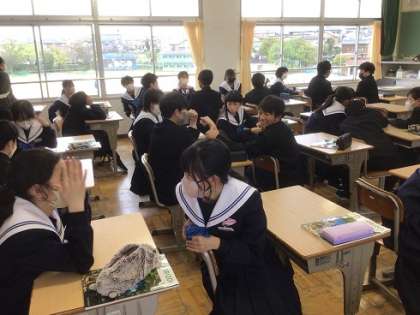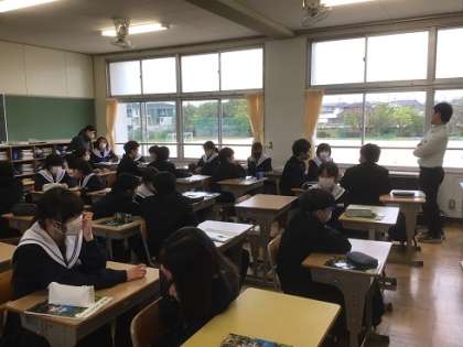 1年生の英語科です。先生が英語で話した自己紹介の内容について、近くの人と相談しながら確認しています。