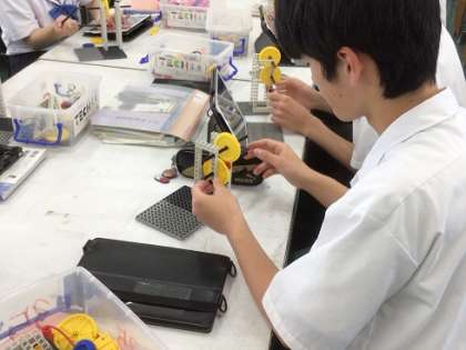 2年生の技術科です。ギヤの計算方法について、教材を活用しながら取り組んでいます。エネルギー変換に関する学習になります。