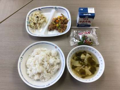 今日の給食には、こどもの日にちなんで「かしわもち」が出ました。あと、かつおのそぼろ丼(麦ごはん)、若竹汁、ごぼうサラダでした。