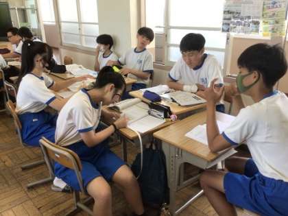 3年生の理科です。「力と運動」について、器具を使って実験をしています。その結果を考察しながら、理科的な見方や考え方を深めていきます。