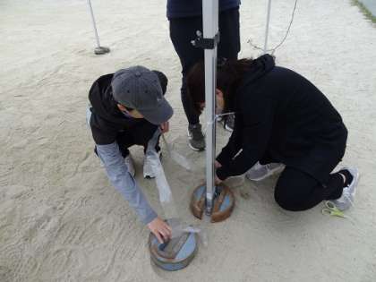 テントを設営し、水の出る方向を確かめながら、ミストシャワーのついたホースを取り付けます。