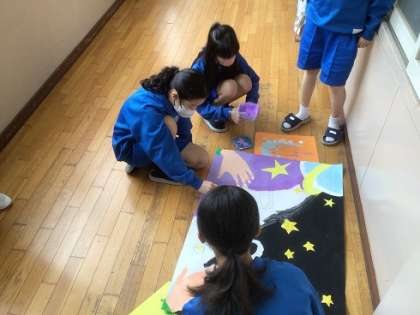 写真は、朝の時間を活用して学級旗を制作している1年生です。初めての体育祭に向けて、がんばっています。