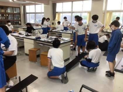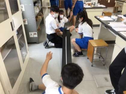 3年生の理科です。力と運動について、器具を使って記録を取りながら実験をしています。それぞれのグループで、協力しながら取り組んでいました。