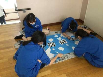 体育祭日課における午後の活動の様子です。学級旗を制作している2年生です。とても丁寧に進めていました。
