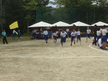 写真上は、準備運動の様子です。写真下は、1年生の全員リレーです。さあ、次は本番ですね。