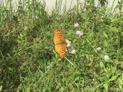 校内の花々の間をひらひらととんでいる蝶を見つけました。ヒョウモンチョウという種類の仲間だと思われます。