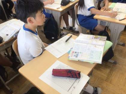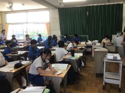 2年生の社会科です。日本の人口問題について学習を進めています。自分の考えを発言できる生徒がとても多くいました。