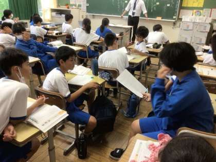 1年生の道徳科です。実習生が授業を行っています。近くの子と意見交換をしながら、学習を進めていました。